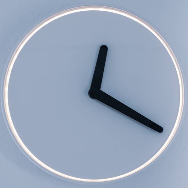 The clock face is a simple circle of bright neon light that casts a warm, inviting glow across the room. The black hands are long and slender, adding to the clock's minimalist aesthetic. The clock measures 12 inches in diameter, making it a perfect size for any wall.